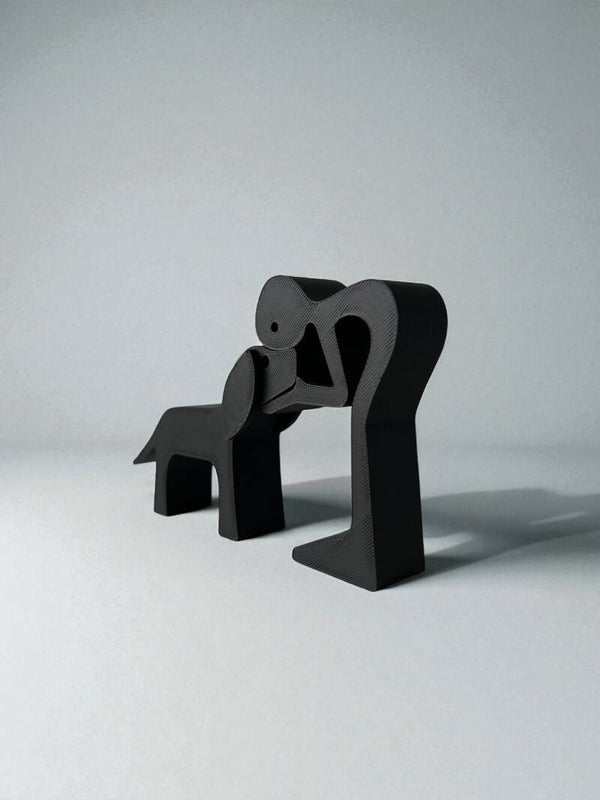 Dit elegante en minimalistische beeldje ,een persoon die zich liefdevol voorover buigt naar zijn trouwe viervoeter.