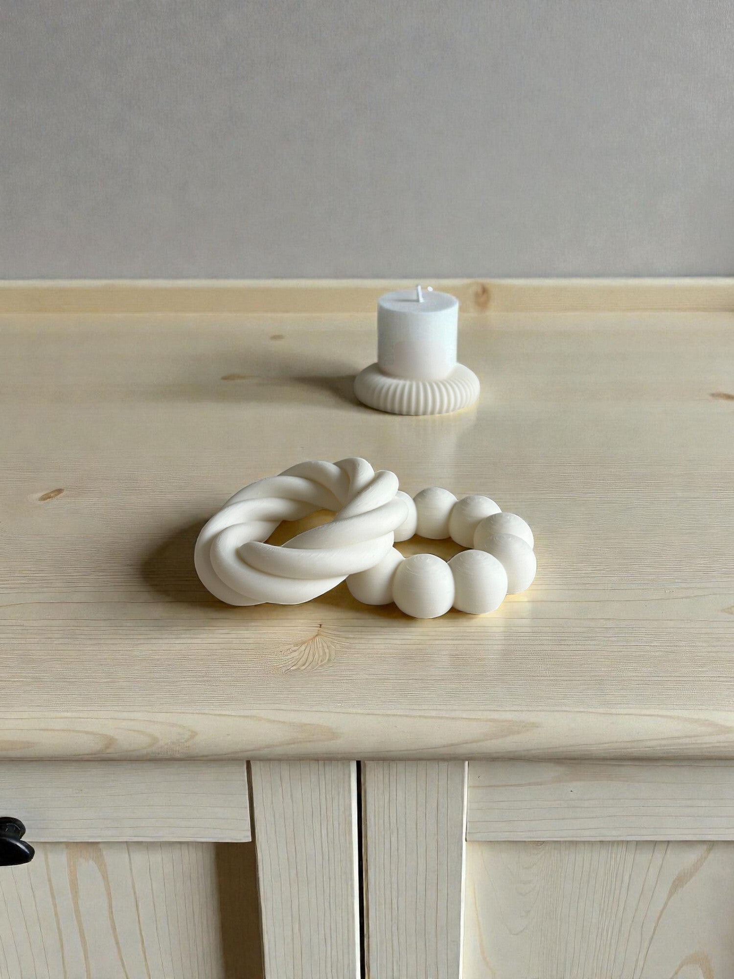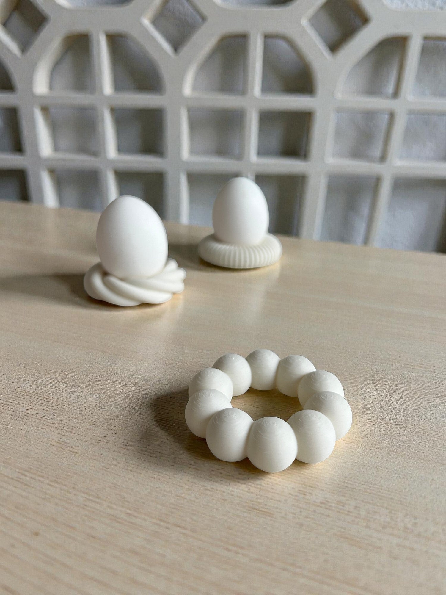 Deze stijlvolle set bestaat uit drie elegante eihouders met een speels, ringvormig ontwerp en zacht afgeronde segmenten. Het minimalistische design in mat wit geeft de decoraties een moderne en verfijnde uitstraling, waarbij vorm en functionaliteit perfect samenkomen.